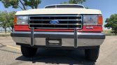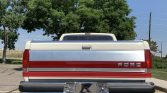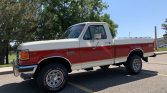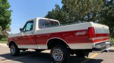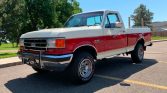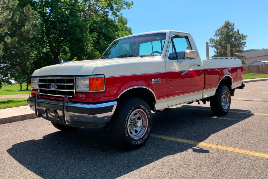 This 1988 Ford F-150 XLT Lariat is a standard-cab Styleside pickup that is finished in two-tone white and red over a red cloth interior and is powered by a fuel-injected 5.0-liter V8 paired with a five-speed manual transmission and a dual-range transfer case. Additional equipment includes air conditioning, cruise control, an AM/FM cassette stereo, a sliding rear window, a receiver hitch, slotted chrome bed rails, and 15″ steel wheels. The truck was originally delivered to Yadkin Valley Motor Company in North Wilksboro, North Carolina, and was acquired by the seller in 2020.