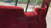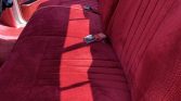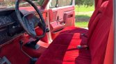 The cab features a bench seat upholstered in Scarlet Red cloth along with a matching dashboard, carpets, and door panels. Amenities include air conditioning, cruise control, an AM/FM cassette stereo, a lockable glovebox, and power windows and door locks.