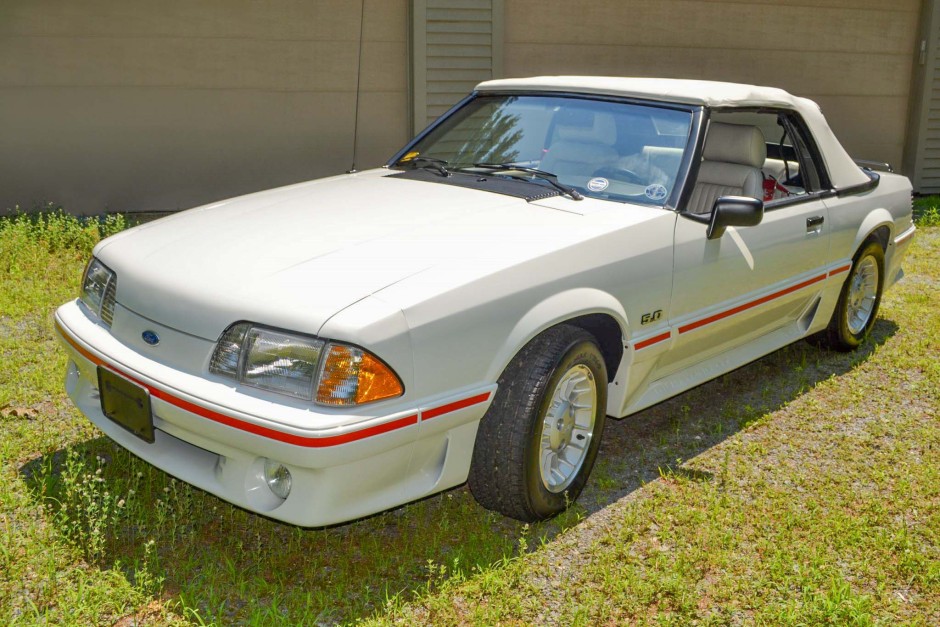 The car is finished in Oxford White (9L) with a white convertible soft top and red accent striping on the side moldings and bumpers. Features include a Mustang GT–specific front bumper with integrated fog lights in addition to “5.0” fender badging, side skirts, a rear apron, louvered taillights, and a luggage rack on the trunk lid.