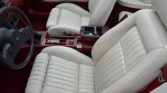 The cabin features seating surfaces upholstered in white leather with a contrasting Scarlet lower dashboard, center console, door panels, and carpeting. Amenities include air conditioning, articulated front sport seats with power-adjustable lumbar support, an AM/FM/cassette stereo, a premium sound system, cruise control, power windows, and power door locks.