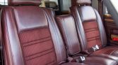 The cabin features power-adjustable front bucket seats trimmed in burgundy leather with cloth inserts along with a matching dashboard, rear bench, door panels, and carpeting. Amenities include air conditioning, cruise control, power accessories, and a cassette player.