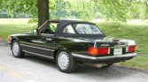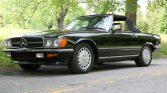 This 1988 Mercedes-Benz 560SL is finished in black over Palomino leather and is powered by a 5.5-liter V8 paired with a four-speed automatic transmission. Equipment includes a body-colored removable hardtop, a black soft top, 15″ Gullideckel alloy wheels, Euro-style bumpers, fog lights, automatic climate control, cruise control, and a Pioneer CD stereo