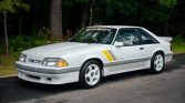 This 1989 Saleen SSC Mustang is chassis #168 of Saleen Autosport’s unofficial Saleen Super Car tribute production commemorating the 25th anniversary of the Ford Mustang. All Saleen SSC Mustangs were finished in Oxford White with gray trim and Saleen SSC graphics over gray and white leather upholstery. The hatchback is powered by a 5.0-liter V8 paired with a five-speed manual transmission and a limited-slip differential. Equipment includes a Hurst quick-ratio shifter, white 16″ wheels, a rear spoiler,…