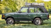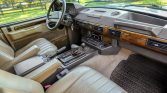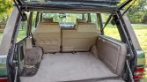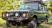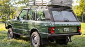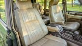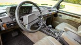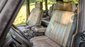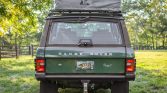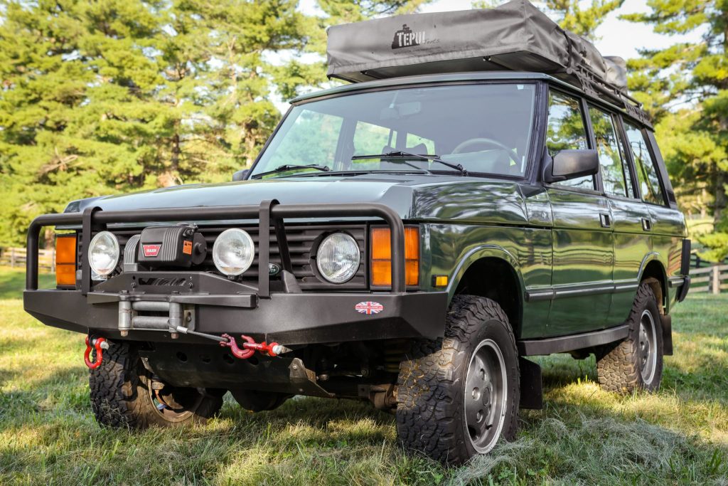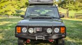 This 1989 Land Rover Range Rover is finished in green over a beige leather interior and is powered by a 3.9-liter V8 mated to a four-speed automatic transmission and a two-speed transfer case. Factory equipment includes a sunroof, air conditioning, power seats, power windows, driving lights, skid plates, taillight guards, a receiver hitch, and 16″ tri-spoke alloy wheels.
