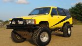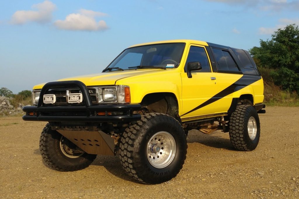 This 1989 Toyota 4Runner SR5 is finished in yellow and black over a gray cloth interior and is powered by a 3.4-liter 5VZ-FE V6 paired with a five-speed manual transmission and a dual-range transfer case. Additional equipment includes a removable hardtop, a sunroof, air conditioning, a Pro Comp skid plate, a Pro Comp suspension lift, and 15″ polished aluminum wheels.