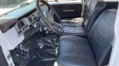 The six-place cabin features reupholstered black vinyl seats with contrasting white stitching along with a matching dashboard and door panels. Features include body-color sheet metal, a locking glovebox, footwell vents, a fire extinguisher, and custom vinyl floor liners.