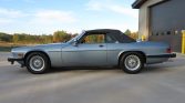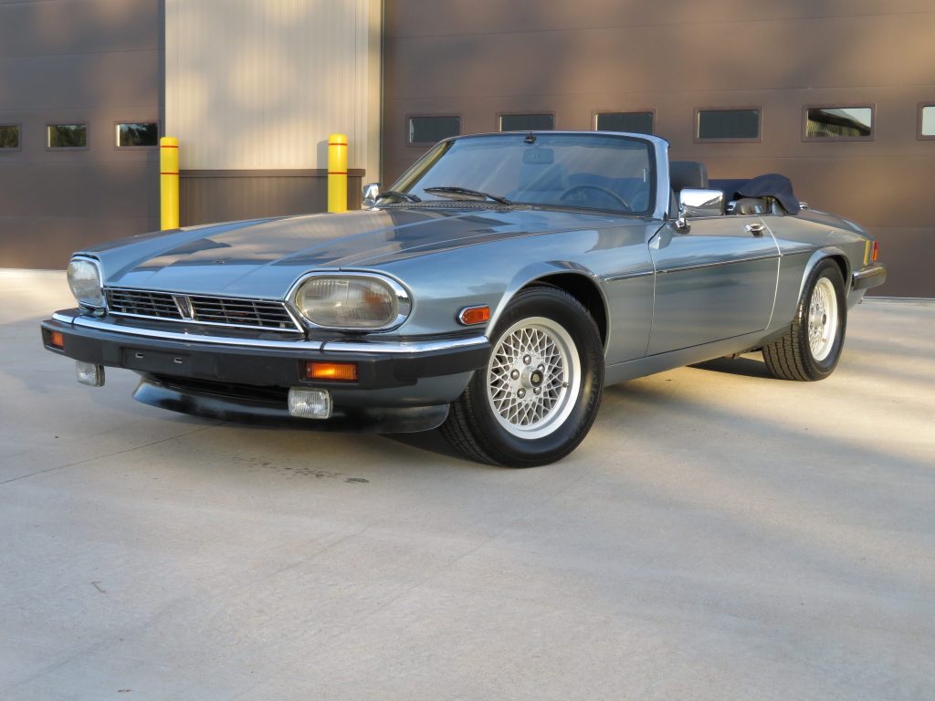 This 1990 Jaguar XJ-S convertible is finished in Diamond Blue Metallic over blue leather and is powered by a 5.3-liter V12 paired with a three-speed automatic transmission. Features include a blue soft top, later-style headlights, 15″ basketweave wheels, automatic climate control, cruise control, and a JVC CD stereo. The car is said to have remained with its original owner until it was acquired by the seller in July 2021, and subsequent service has reportedly included replacing the tires, air conditioning compressor, and hood struts.