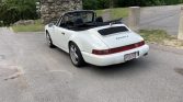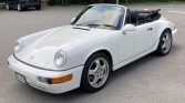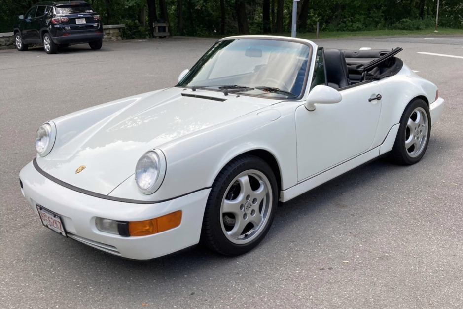 This 1990 Porsche 911 Carrera 2 convertible was acquired by the current owner in 2006 and is finished in Grand Prix White over a black leather interior. Power is provided by a 3.6-liter flat-six paired with a Tiptronic four-speed automatic transaxle, and additional equipment includes a black soft top, a speed-activated rear spoiler, air conditioning, an Alpine stereo, power-adjustable front seats, and staggered-width 17″ Cup wheels.