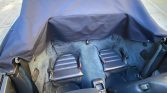 The seats are upholstered in blue leather, and equipment includes cruise control, air conditioning, an Alpine CD stereo paired with an MTX amplifier, and power windows and locks. The left seat has three holes from a previously installed harness, and holes were made in the carpet for installation of a roll cage that has since been removed. The shift linkage bushings and front decklid struts were replaced in September 2021.