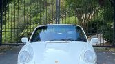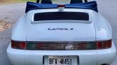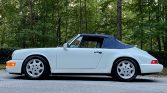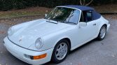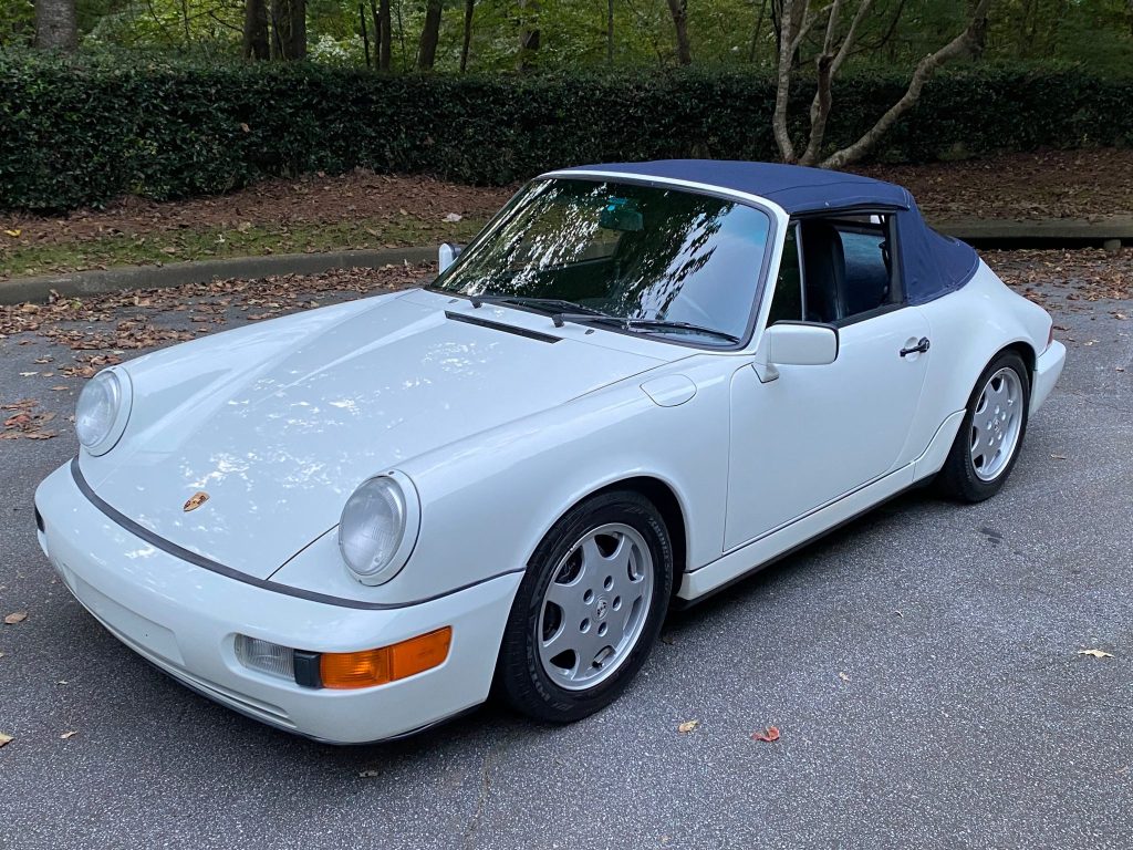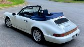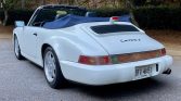 This 1990 Porsche 911 Carrera Cabriolet is finished in white over blue leather and is powered by an air-cooled 3.6L flat-six paired with a five-speed manual transaxle. Equipment includes a blue soft top, air conditioning, cruise control, and fog lights, while modifications consist of height-adjustable H&R coilover springs, a K&N air intake, an Alpine CD stereo, aftermarket exhaust components, and performance engine chip. The car is said to have been first registered in New Orleans before relocating to Georgia, where the current owner acquired the car 21 years ago. Recent maintenance included wiring repairs and replacement of the valve cover gaskets, shifter bushings, spark plugs, steering rack boots, and oil pressure sending unit.