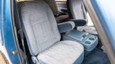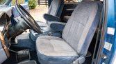 The interior features front seats with foldable armrests upholstered in blue cloth along with a matching rear bench seat. Faux wood trim accents the dash, and floor mats protect the blue carpets. Amenities include air conditioning, cruise control, a lockable center console, an AM/FM stereo with a cassette player, and power windows and door locks. According to the seller, the power window switch, rearview mirror, and window regulator have been replaced.
