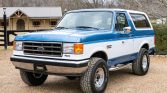 This 1991 Ford Bronco XLT has been registered in North Carolina since new and was acquired by the Tennessee-based seller in 2021. The truck is powered by a 5.0-liter V8 paired with a five-speed manual transmission and a dual-range transfer case and is finished in blue and white over a blue interior. Equipment includes a white removable hardtop, a power-operated rear window, cruise control, chrome aftermarket wheels, and a factory AM/FM cassette stereo. Work carried out by the seller is said to have consisted of refreshing the cooling and fuel systems as well as replacing the tires, exhaust system, rear main seal, and clutch kit.