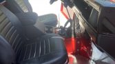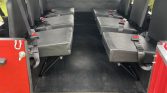 The interior features replacement front seats and six inward-facing rear jump seats upholstered in black vinyl. Amenities consist of a leather-covered dashboard accented by red stitching, a padded center console with cupholders, sun visors, and seatbelts for all eight occupants.