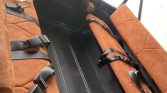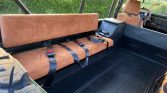 The interior features replacement front bucket seats as well as inward-facing rear benches upholstered in brown synthetic suede. Amenities consist of a pair of storage consoles, an aftermarket wood-rimmed steering wheel, and seatbelts for all eight oLupants.