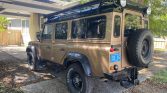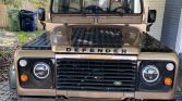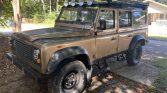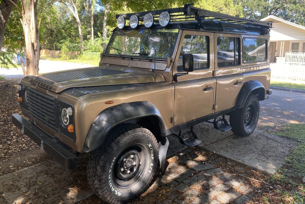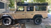 This 1991 Land Rover Defender 110 is a left-hand-drive example that is said to have been imported from Greece by a South Carolina dealer, from whom it was acquired by the seller in March 2021. The truck is finished in gold over tan vinyl, and power is from a carbureted 3.5-liter V8 paired with a five-speed manual transmission and a dual-range transfer case. Additional equipment includes a full-length roof rack, LED headlamps, auxiliary lighting, black 16″ steel wheels, aftermarket audio components, a backup camera, and a shower system. An alignment, air conditioning service, and oil change were carried out under current ownership.