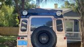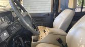 The cabin is trimmed in tan vinyl upholstery accented by black carpeting and door panels. Amenities include a storage console with aftermarket switches, a Boss Audio touchscreen stereo with a backup camera display, door nets, and an air conditioning system that is said to have been serviced under current ownership. A shower outlet in the upper left corner of the roof is plumbed to a water tank in the cargo area.