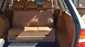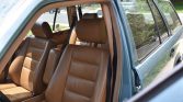The cabin features seats upholstered in Palomino leather with matching door panels and carpets. Amenities include heated and power-adjustable front seats, automatic climate control, power windows and door locks, and a Becker Grand Prix cassette stereo. The wood finish on the center console shows crazing, wear is visible on the center armrest, and there is a stain on the front passenger seat cushion.