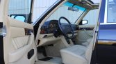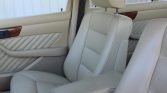 The seats are upholstered in tan leather with matching carpets and Zebrano wood trim on the doors, dashboard, and center console. Amenities includes automatic climate control, cruise control, power windows and locks, a Mercedes-branded Becker Grand Prix cassette stereo, and power-adjustable front seats and head restraints.