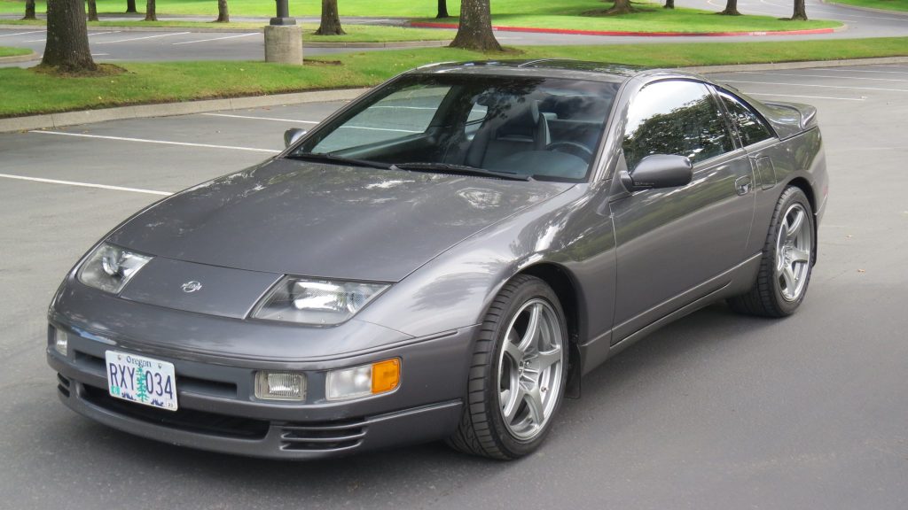 This 1991 Nissan 300ZX Twin Turbo is finished in Charcoal Pearl over Charcoal leather and is powered by a twin-turbocharged 3.0-liter V6 paired with a four-speed automatic transmission and a limited-slip differential. Equipment includes projector headlights, 17″ alloy wheels, Super HICAS four-wheel steering, removable glass roof panels, a rear spoiler, a rear wiper, automatic climate control, cruise control, a Kenwood CD stereo, and power windows.