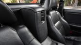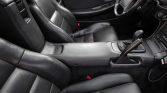 The cabin features manually-adjustable black leather (LA22) sport seats with matching carpets and door panels. A period Motorola car phone was installed under previous ownership, and additional amenities include power windows and locks, air conditioning, cruise control, and a factory CD/cassette stereo.