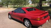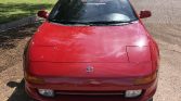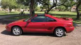 This 1991 Toyota MR2 Turbo is finished in Crimson Red over black leather and is powered by a turbocharged 2.0-liter inline-four mated to a five-speed manual transaxle. Additional features include glass T-top panels, a period Motorola car phone, air conditioning, power steering, cruise control, and a CD/cassette stereo.