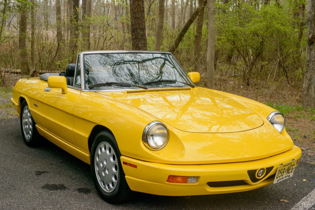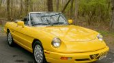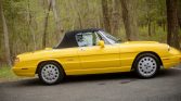 This 1992 Alfa Romeo Spider Veloce is finished in yellow over black leather and powered by a 2.0-liter inline-four paired with a five-speed manual transmission. Equipment includes a black soft top, a Sony cassette stereo, air conditioning, 15″ light alloy wheels, power windows, and body-colored mirror caps and bumpers. The car was first delivered to Springfield Imported Motors in New Jersey, and it remained in the state through its acquisition by the seller in March 2021. It now…
