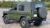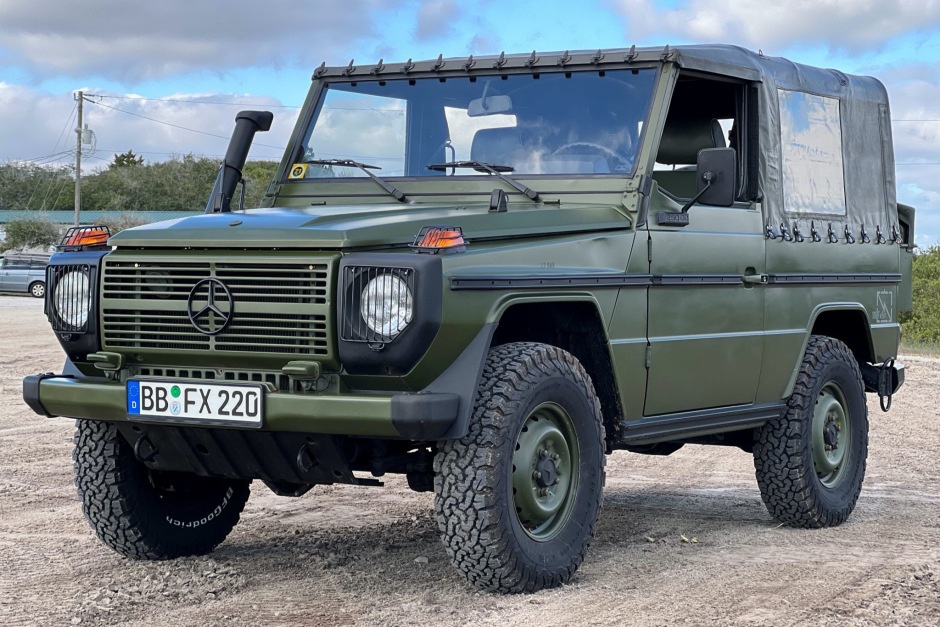 This 1992 Mercedes-Benz 250GD is finished in matte green over matching vinyl and is powered by a 2.5-liter turbodiesel inline-five paired with a five-speed manual transmission and a dual-range transfer case. Equipment includes headlight and turn signal grilles, a snorkel, 16″ steel wheels, a green soft top, a receiver hitch, a rear-mounted spare tire, a shovel, and a heater. The truck was reportedly used by the German army before it was imported to the US in March 2021 from the Netherlands. Modifications performed prior to the seller’s purchase in July 2021 included the addition of a turbocharger and the installation of a five-speed manual transmission.