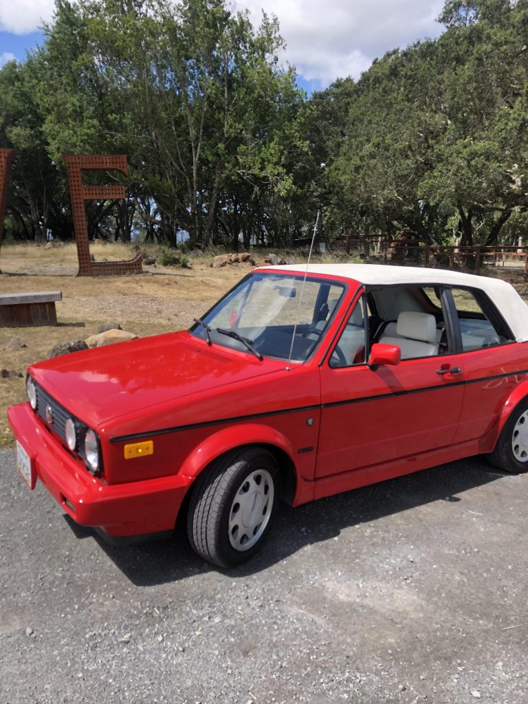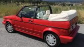 This 1992 Volkswagen Cabriolet Wolfsburg Edition was purchased new by the owner from Boardwalk Volkswagen in Redwood City, California, and now shows 51k miles. The car is finished in Flash Red over a white vinyl interior, and power comes from a 1.8-liter inline-four paired with a five-speed manual transaxle. Features include a white soft top, 14″ wheels, air conditioning, power front windows, and an AM/FM cassette stereo. Work carried out in June 2020 consisted of replacing the clutch cable and headlight.