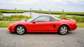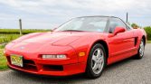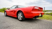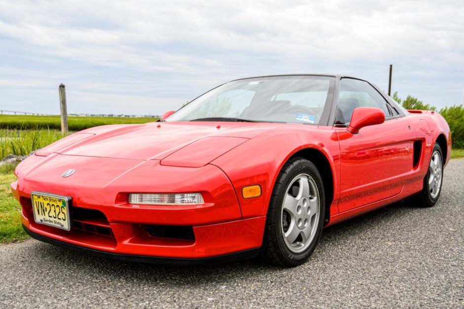 This 1993 Acura NSX is finished in red over black leather and powered by a 3.0-liter VTEC V6 paired with a five-speed manual transaxle and a limited-slip differential. Equipment includes automatic climate control, power-adjustable seats, an Acura/Bose audio system, cruise control, a custom-installed radar detector, and an aftermarket alarm. The car was acquired by the seller’s father in 1998, and the oil was changed in preparation for the sale.
