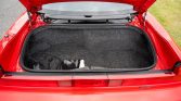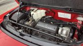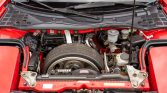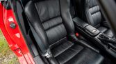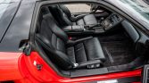 The aluminum body is finished in Formula Red (R-77) and features a black roof, retractable projector beam headlights, integrated fog lights, a rear spoiler, and dual chrome exhaust outlets.