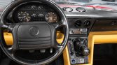 The interior features bucket seats upholstered in tan leather with sueded cloth inserts along with two-tone dash pads and door panels and black carpets. Equipment includes power windows, air conditioning, an analog clock, and an Alpine AM/FM/cassette stereo. The leather is said to have been reconditioned and re-dyed, and the power mirror switch, left power window mechanism, speakers in the doors and rear tray, and the power antenna have reportedly been replaced.