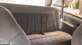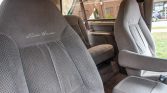 The cabin features front captain’s chairs and a rear bench upholstered in beige cloth with matching door panels and brown carpets. Equipment includes air conditioning, cruise control, a center console with integrated cup holders, a JVC CD stereo, and power windows, locks, and mirrors. Flaws include a missing front passenger armrest, wear on the driver’s armrest and door panel, and broken center and right-side air vents.