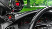 Instrumentation includes a 160-mph speedometer, a 9k-rpm tachometer, a boost gauge, and fuel level and coolant temperature gauges. A pair of configurable AEM serial gauges were added to the driver-side A-pillar, though the seller states they require programming. The six-digit odometer shows 54k miles.