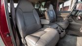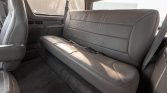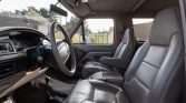 The interior features front captain’s chairs and a rear bench seat trimmed in beige leather with “Eddie Bauer” logos embroidered on the front headrests. Equipment includes air conditioning, cruise control, a center armrest with cupholders, electric windows, and a factory cassette stereo.