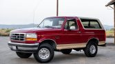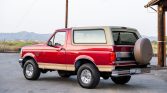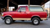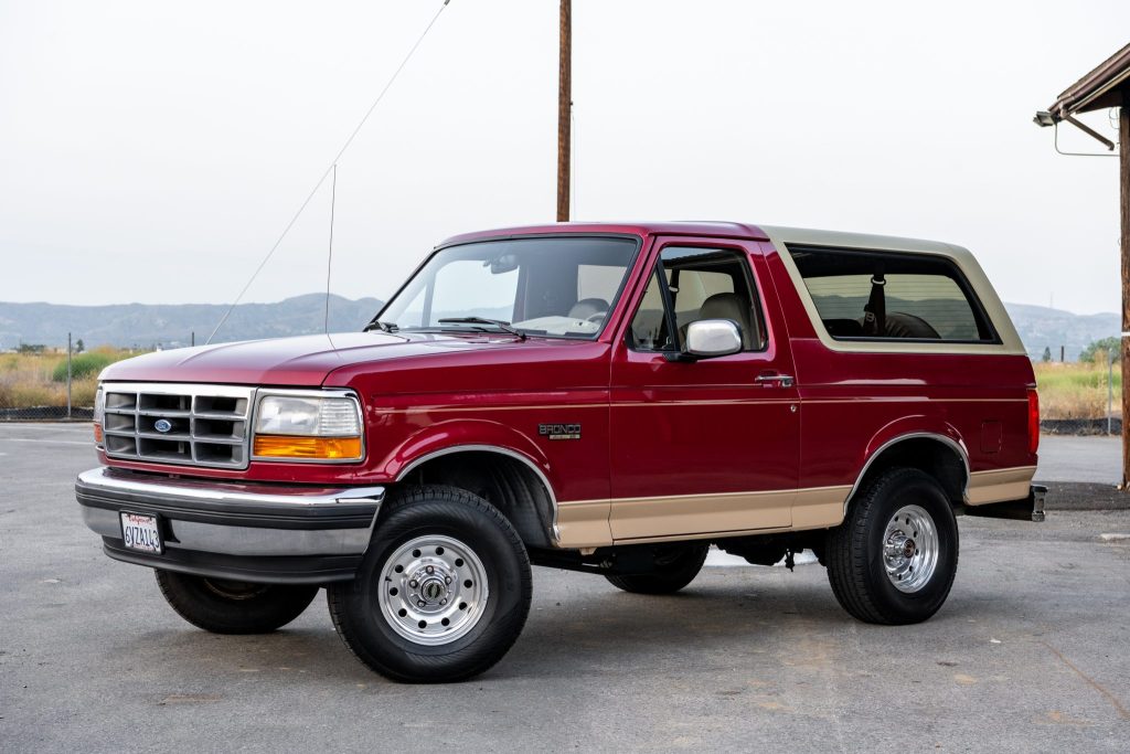 This 1994 Ford Bronco is an Eddie Bauer example that is finished in two-tone metallic red and beige over beige leather upholstery. Power comes from a 5.0-liter V8 paired with a four-speed automatic transmission and a dual-range transfer case. Equipment includes a removable fiberglass hardtop, forged 15″ aluminum wheels, manually locking front hubs, power-assisted front disc brakes, a swing-away rear tire carrier, air conditioning, and a cassette stereo. The truck was first registered in Mississippi and later moved to California, where it was acquired by the seller in July 2021.