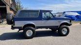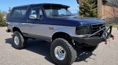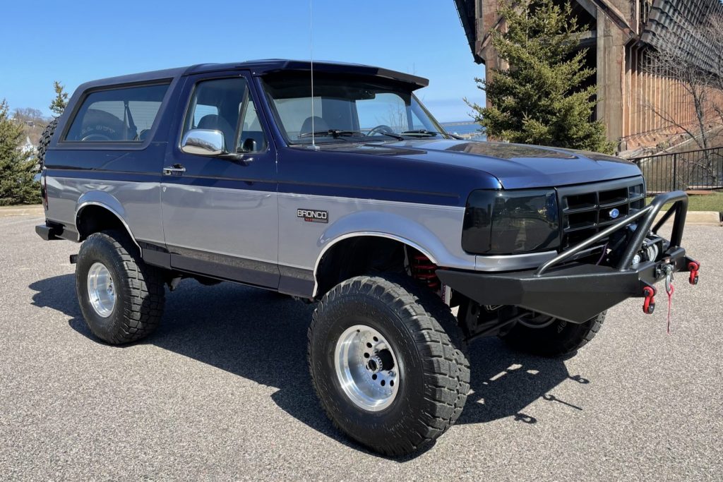This 1994 Ford Bronco XLT is finished in two-tone blue and silver over gray cloth, and power is from a 5.8-liter V8 linked with a four-speed automatic transmission and a dual-range transfer case. Modifications are said to include a Skyjacker suspension lift, a Yukon locking rear differential, 4:56:1 gearing, a MagnaFlow muffler, a Superwinch winch, steel bumpers, and polished 15″ American Racing wheels. Recent work reportedly included servicing the power rear window, a front end alignment, and replacing…