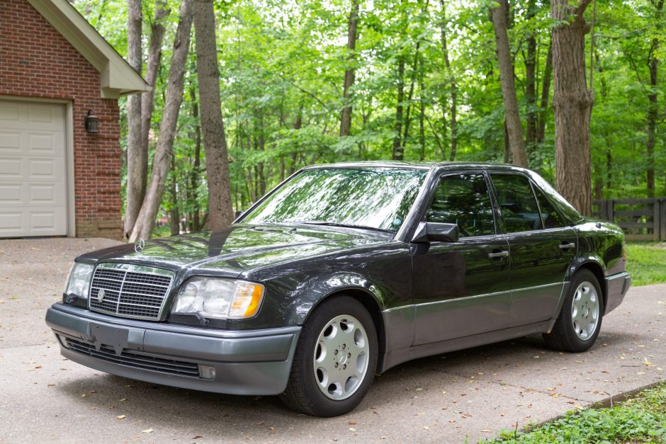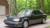 This 1994 Mercedes-Benz E500 is finished in Black Pearl Metallic with gray lower cladding over black leather upholstery and is powered by a 5.0-liter V8 paired with a four-speed automatic transmission. Equipment includes a sunroof, cruise control, automatic climate control, 16″ alloy wheels, a self-leveling suspension system, heated and power-adjustable front seats, and a Becker cassette stereo. The car spent time in Ohio, Indiana, and Florida prior to the seller’s acquisition and subsequent relocation to Kentucky in August 2011. Service completed in October 2020 included an oil change and replacement of the fuel filter and a fuel hose.