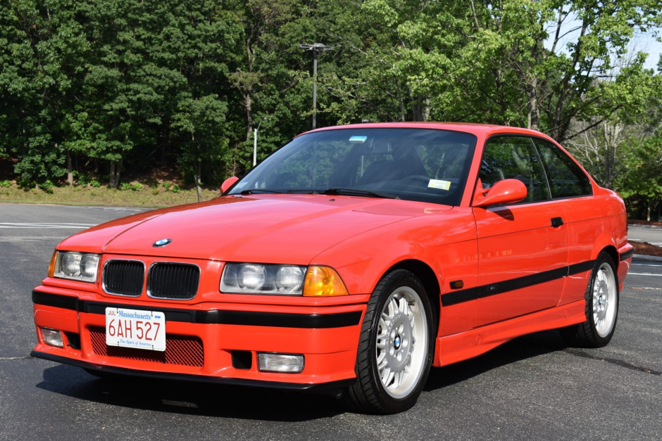 The car is finished in Hellrot (314) with a black front lip and side moldings. Pre-facelift E36 M3s featured thinner kidney-grille surrounds, and this example is equipped with fog lights and a sunroof.