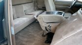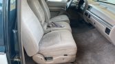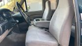 The cab features front and rear bench seats upholstered in tan cloth. Amenities include a fold-down front center console with cup holders, air conditioning, an AM/FM cassette stereo, an electronic brake controller, pop-out cupholders in the extended cab area, and power windows and door locks.