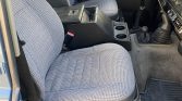 The cabin features seats upholstered in gray vinyl and cloth along with a matching dashboard and door panels. Equipment includes air conditioning, an analog clock, four rear jump seats, sliding rear quarter windows, and a locking center console with an inset AM/FM/cassette stereo.