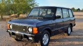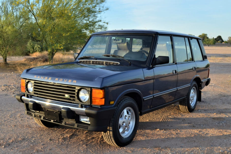 This Land Rover Range Rover Classic County is a long-wheelbase example that was first registered in Canada and subsequently imported to Arizona in 2017 after being acquired by the seller. The truck is finished in Plymouth Blue Metallic over Sorrel Tan Connolly leather, and power is provided by a 4.2-liter V8 mated to a four-speed automatic transmission and a dual-range transfer case. Additional equipment includes mud flaps, 16″ alloy wheels, a receiver hitch, a heated windshield, a powered sunroof, power-adjustable front seats, an AM/FM cassette stereo, air conditioning, and cruise control. Recent service is said to have included replacing the front suspension airbags, radiator, alternator, fuel pump, brake pads and rotors, windshield, and tires.