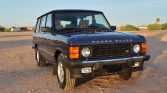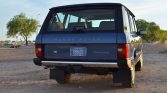 The truck is finished in Plymouth Blue Metallic and features black roof pillars, a receiver hitch, chrome-aLented bumpers, fog lights, and gold “Range Rover” lettering on the hood. The heated windshield and exterior windshield trim were reportedly replaced under current ownership.