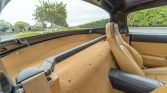The cabin is upholstered in tan leather with matching door panels and carpets. Amenities include air conditioning, an aftermarket shift knob, aluminum pedal covers, a Mazda Sensory Sound system, and a Nardi steering wheel mounted on a quick-release hub.