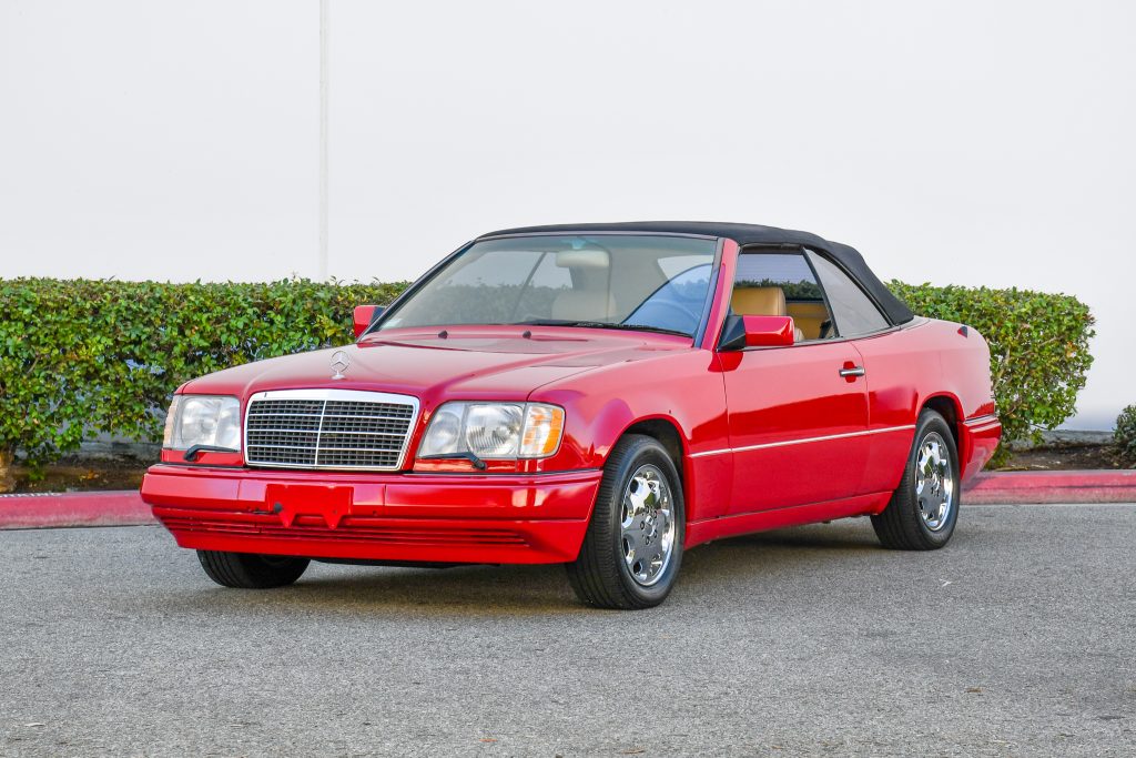This 1995 Mercedes-Benz E320 cabriolet is finished in Imperial Red over Cream Beige leather and powered by a 3.2-liter inline-six paired with a four-speed automatic transmission. Equipment includes a black power-operated soft top, eight-hole 15″ alloy wheels, headlight wipers, heated front seats, automatic climate control, wood trim, and a factory cassette stereo with a trunk-mounted CD changer. A top cylinder was replaced in anticipation of the sale.
