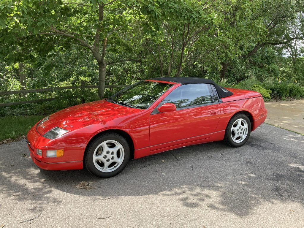 This 1995 Nissan 300ZX convertible is finished in Ultra Red over black leather upholstery, and power is provided by a 3.0-liter V6 paired with a five-speed manual transmission. Equipment includes a black soft top, power-adjustable seats, air conditioning, and a Kenwood CD stereo. The car has remained registered in Wisconsin since new and was acquired in 2011 by the seller. The upper radiator hose was replaced and an oil change was performed in 2020.