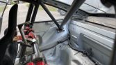 The cabin has been stripped of the carpets, headliner, stereo, and air conditioning and fitted with RS-style door panels, a roll cage with padded door bars, and dual fixed-back Recaro bucket seats with head restraints for the driver. Equipment includes aluminum pedals, a window net, Sabelt and Schroth Racing harnesses, and a Traqmate GPS data logging system mounted under the dash. The seller reports that a Coolshirt system and various removed interior components will accompany the vehicle.