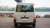 The van is finished in white and features a matching Winnebago-labeled pop-up top, black bumpers and side mirrors, sliding rear side windows, a rear wiper, and a fixed antenna. Based on the long-wheelbase EuroVan, Winnebago-modified vehicles underwent their conversions in the United States prior to being sold through Volkswagen dealerships.