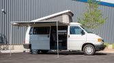 The pop-up roof features zippered screen sections and a bed. A gradient-blue retractable awning is attached above the sliding side door.