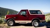 This 1996 Ford Bronco Eddie Bauer 4×4 was first delivered to Butch Outstalet Ford in Gulfport, Mississippi, and subsequently spent time in Louisiana and Colorado until it was acquired by the seller in Idaho in 2020. The truck is finished in dark red over tan cloth and is powered by a 5.8-liter V8 paired with a four-speed automatic transmission and a dual-range transfer case. Additional equipment includes a tan removable hardtop, a swing-away spare tire carrier, air conditioning, cruise control, an aftermarket Kenwood stereo with Pioneer speakers, and 15″ forged aluminum wheels.