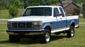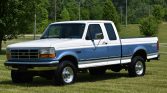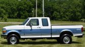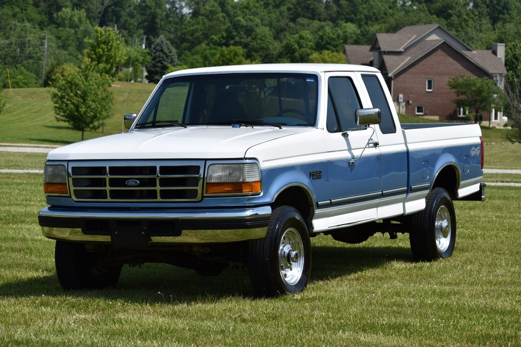This 1996 Ford F-250 XLT is a SuperCab short-bed 4×4 pickup that is finished in two-tone Oxford White and Indigo Blue Metallic over blue cloth, and it is powered by a 7.5L V8 paired with a four-speed automatic transmission and a dual-range transfer case. Equipment includes air conditioning, cruise control, a Kenwood stereo, power windows, forged alloy wheels, dual fuel tanks, and a drop-in bedliner and tonneau cover. The truck was first registered in Oregon, and it was acquired by the seller in 2020 and now has under 97k miles. Maintenance during current ownership included fluid services and replacement of the front main seal, battery, tires, and ignition and braking components.